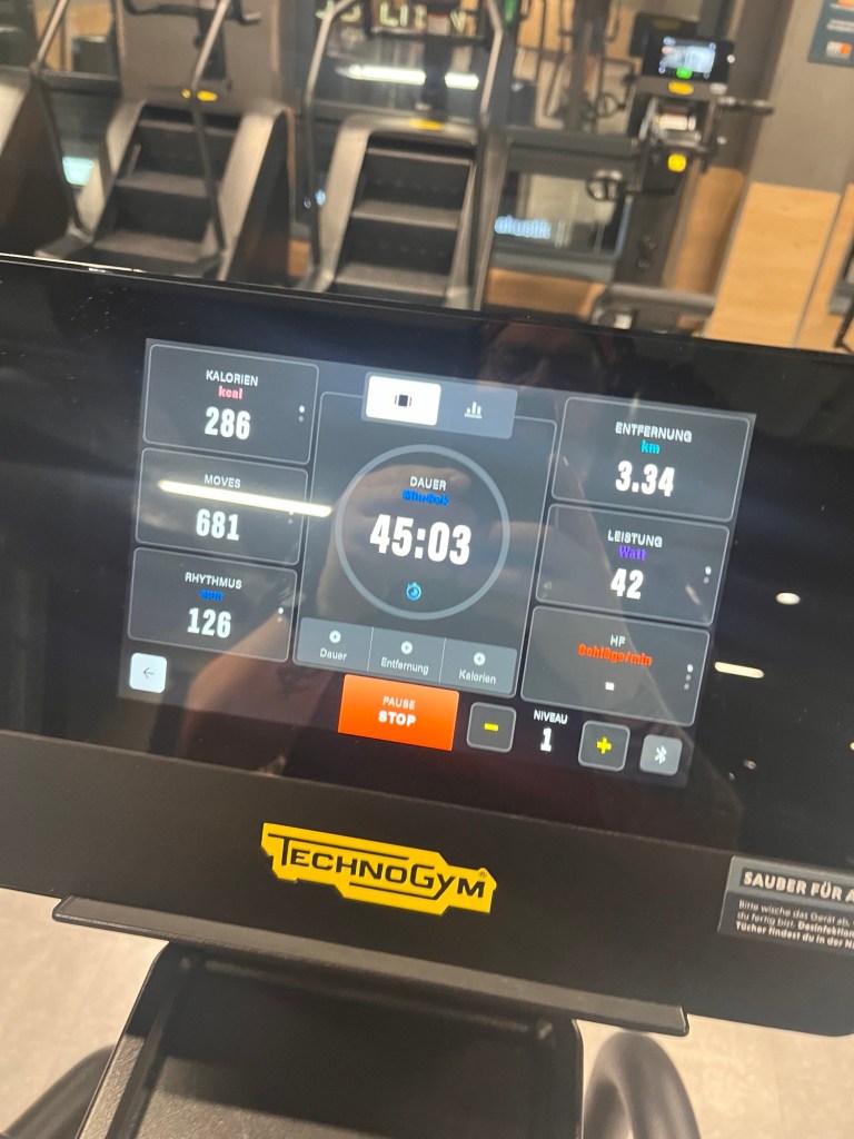 Wie ich es geplant habe, 5.00h aufstehen. Ab ins Gym. Heute mal 45 Crosstrainer gemacht… langsam anfangen… Auch mal für die nächsten Tage eingekauft…